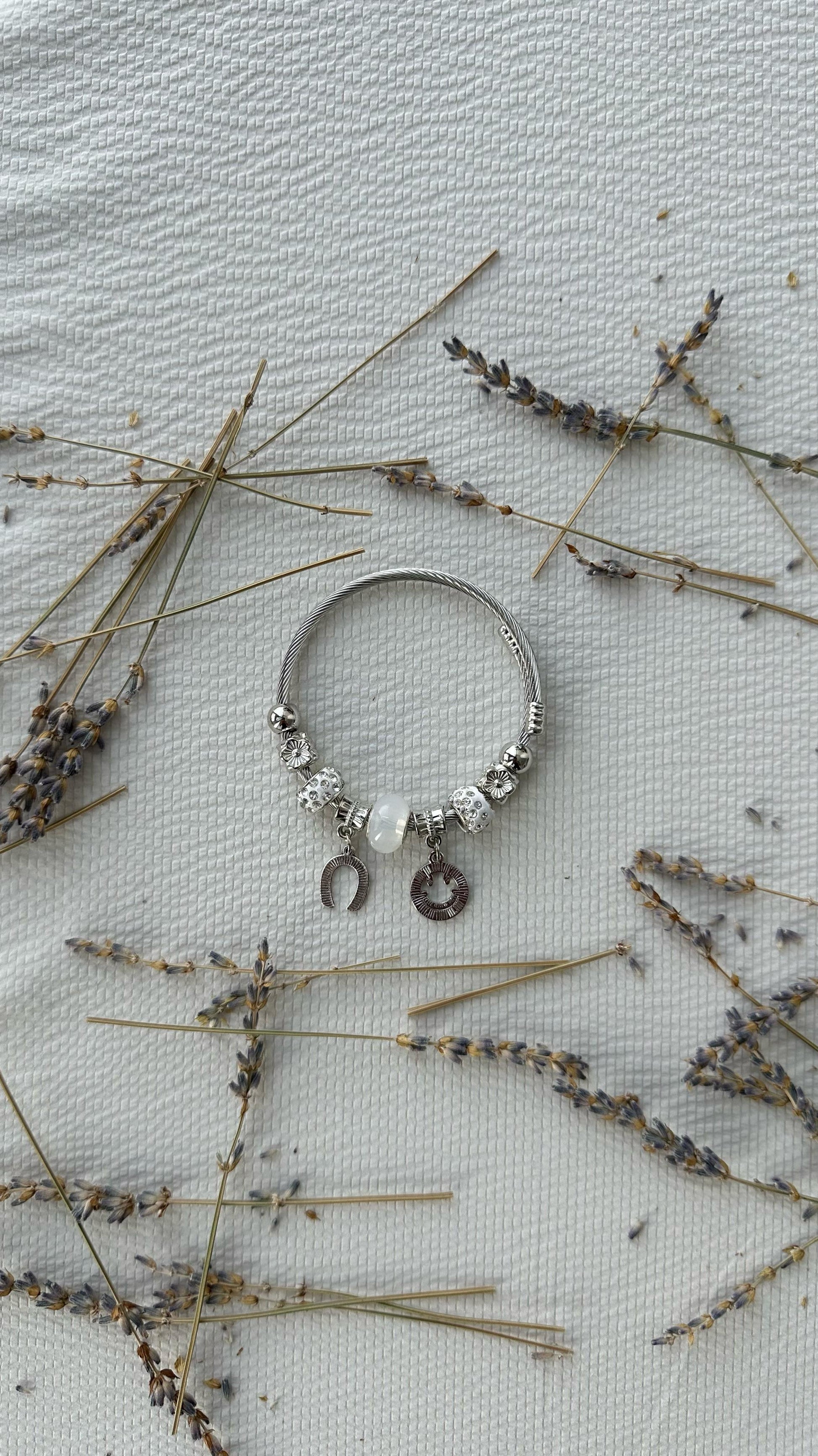 Beyazın zarafeti ve ışıltılı taşlarıyla birlikte At Nalı charmı bu bilekliğe çok güzel bir anlam yüklüyor. At Nalı yüz yıllardır dünyada inanılan şans getirmesiyle bilinir, evlerin duvarlarında bile uğur getirdiğine inanılan At Nalının yanına bir de sevimlilik katan Smile caharmı ekledik. Size şans ve mutluluk verecek...