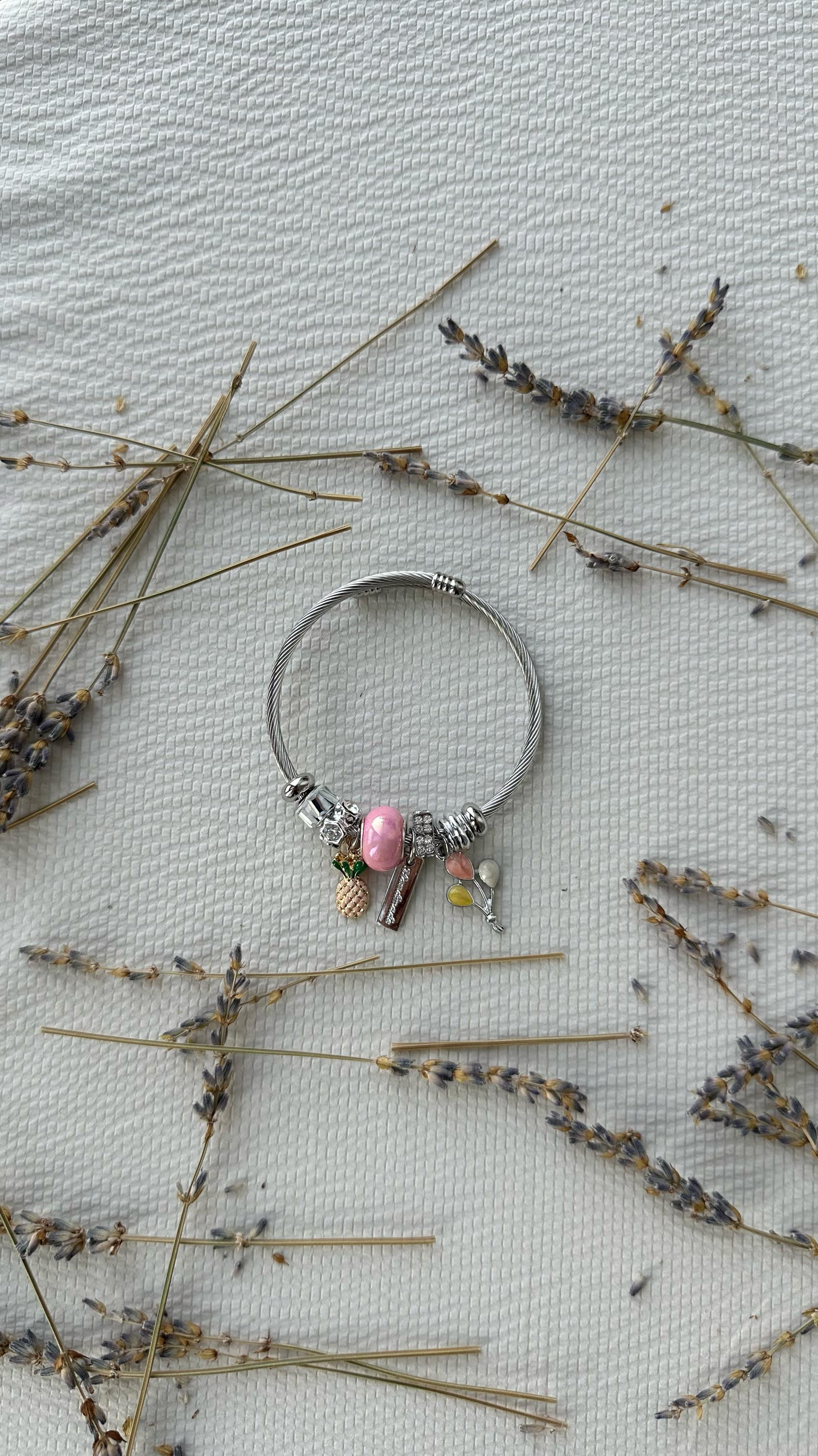 İç açıcı ve rahatlatıcı görüntüsüyle pembe taşın gümüş rengiyle sade uyumuna, özgürlüğün ve çocukluğun sembollerinden biri olan Balon Uçuran Kız charmı ile zenginlik, refah ve servet anlamını taşıyan sevimli Ananas charmı size umut ve rahatlık sağlayacak...